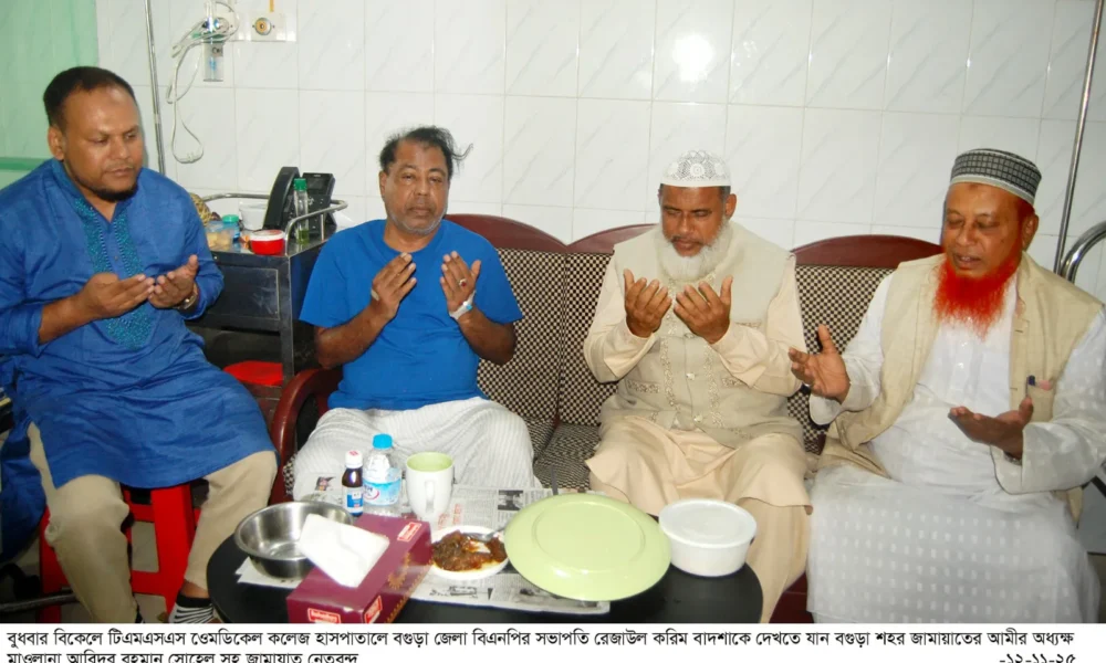 বগুড়া জেলা বিএনপির সভাপতি মো: রেজাউল করিম বাদশা ও দৈনিক বগুড়ার সম্পাদক ডেঙ্গু জ¦রে আক্রান্ত হয়ে টিএমএসএস মেডিকেল কলেজ হাসপাতালে চিকিৎসাধীন রয়েছেন। বুধবার বিকেলে তাকে দেখতে...